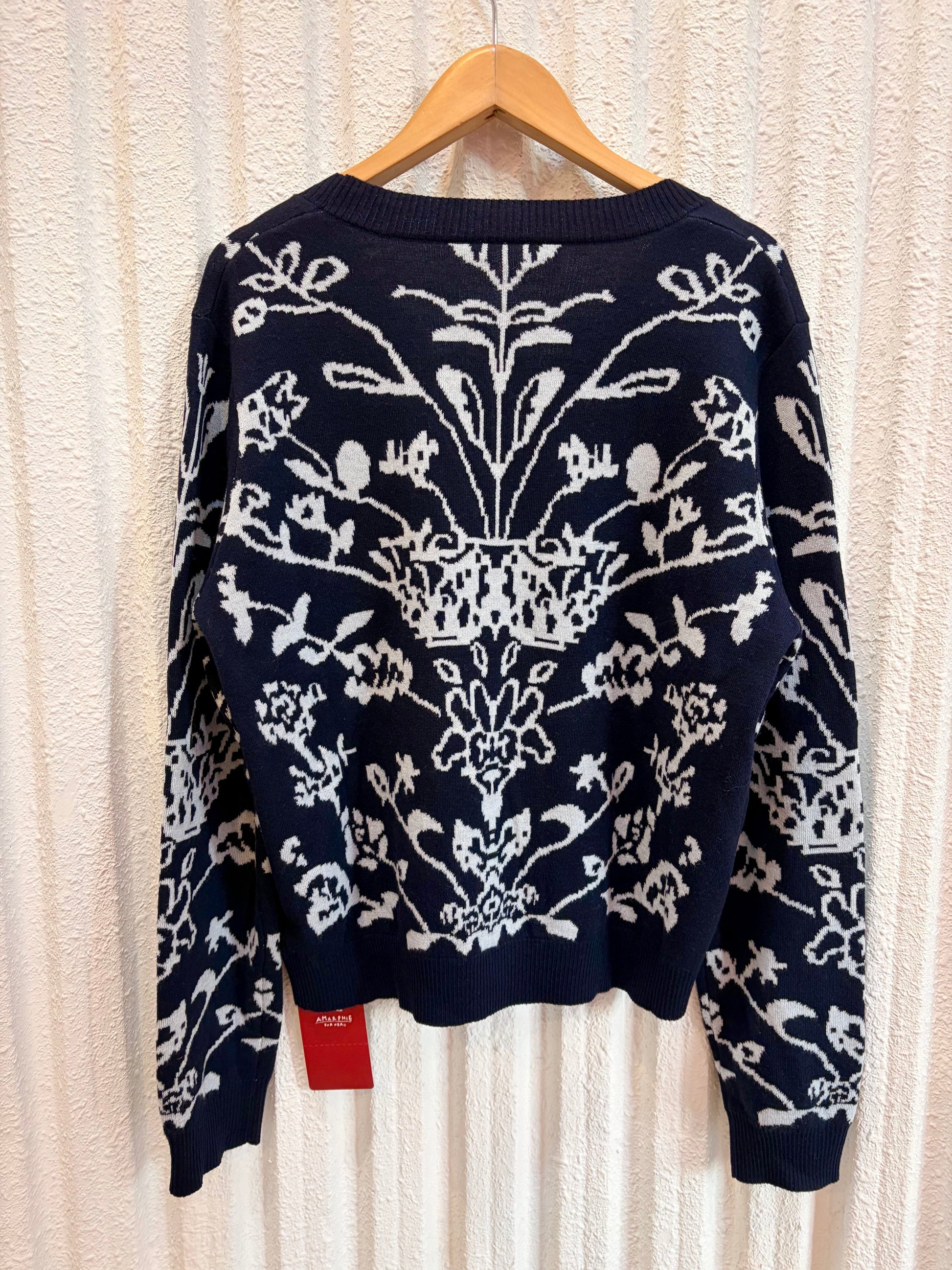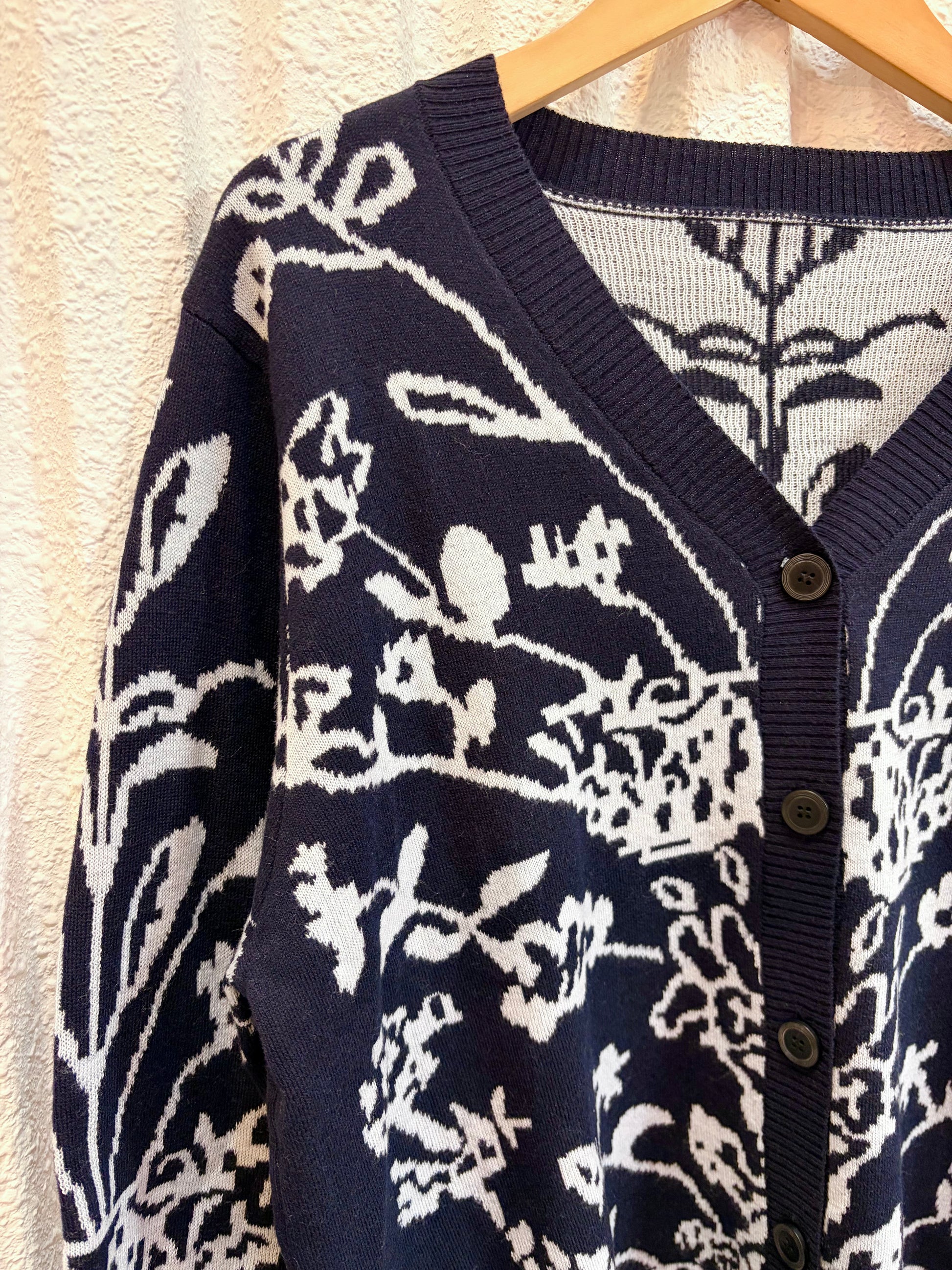 濃紺に白の模様の入ったニットカーディガン。