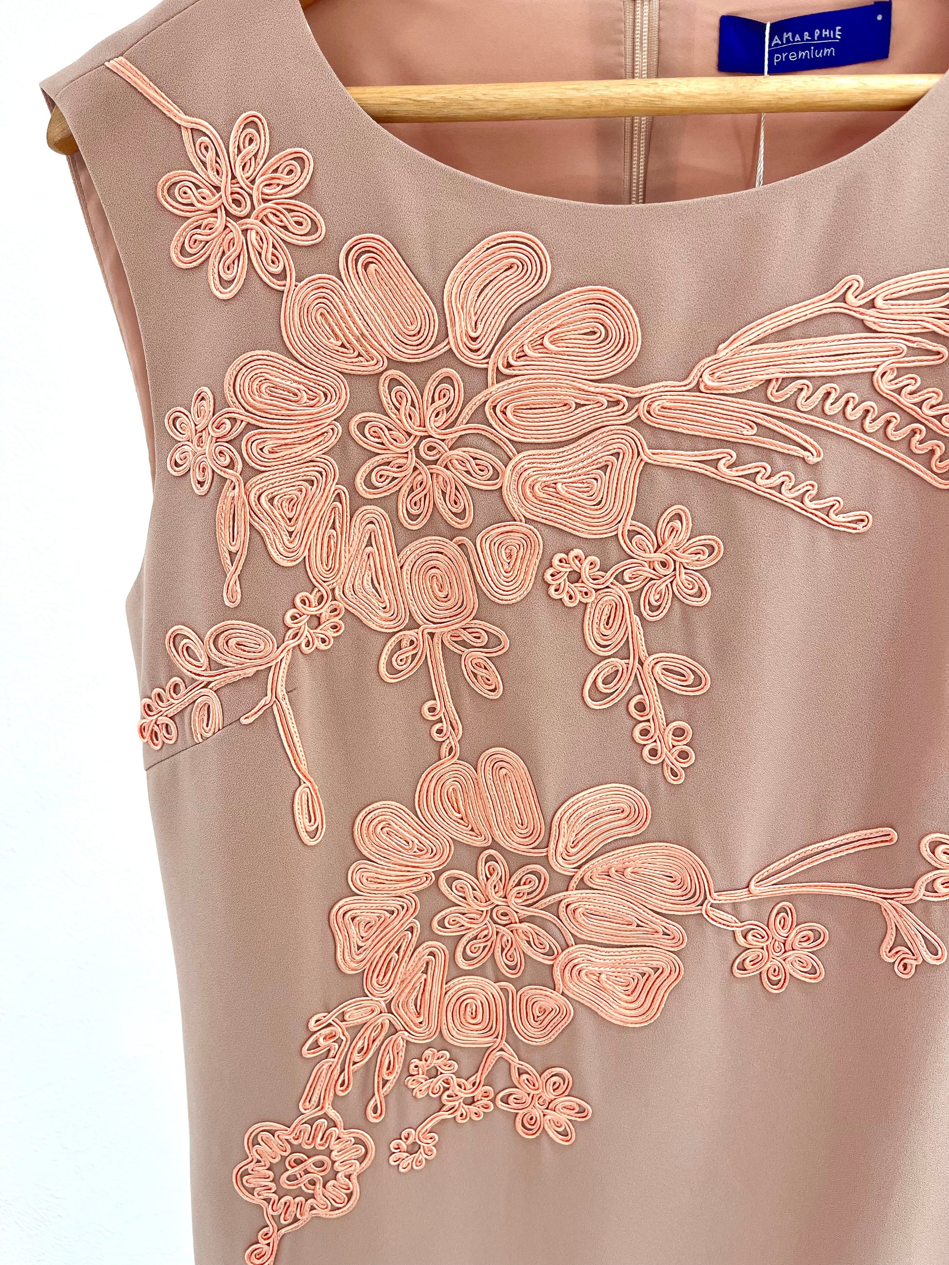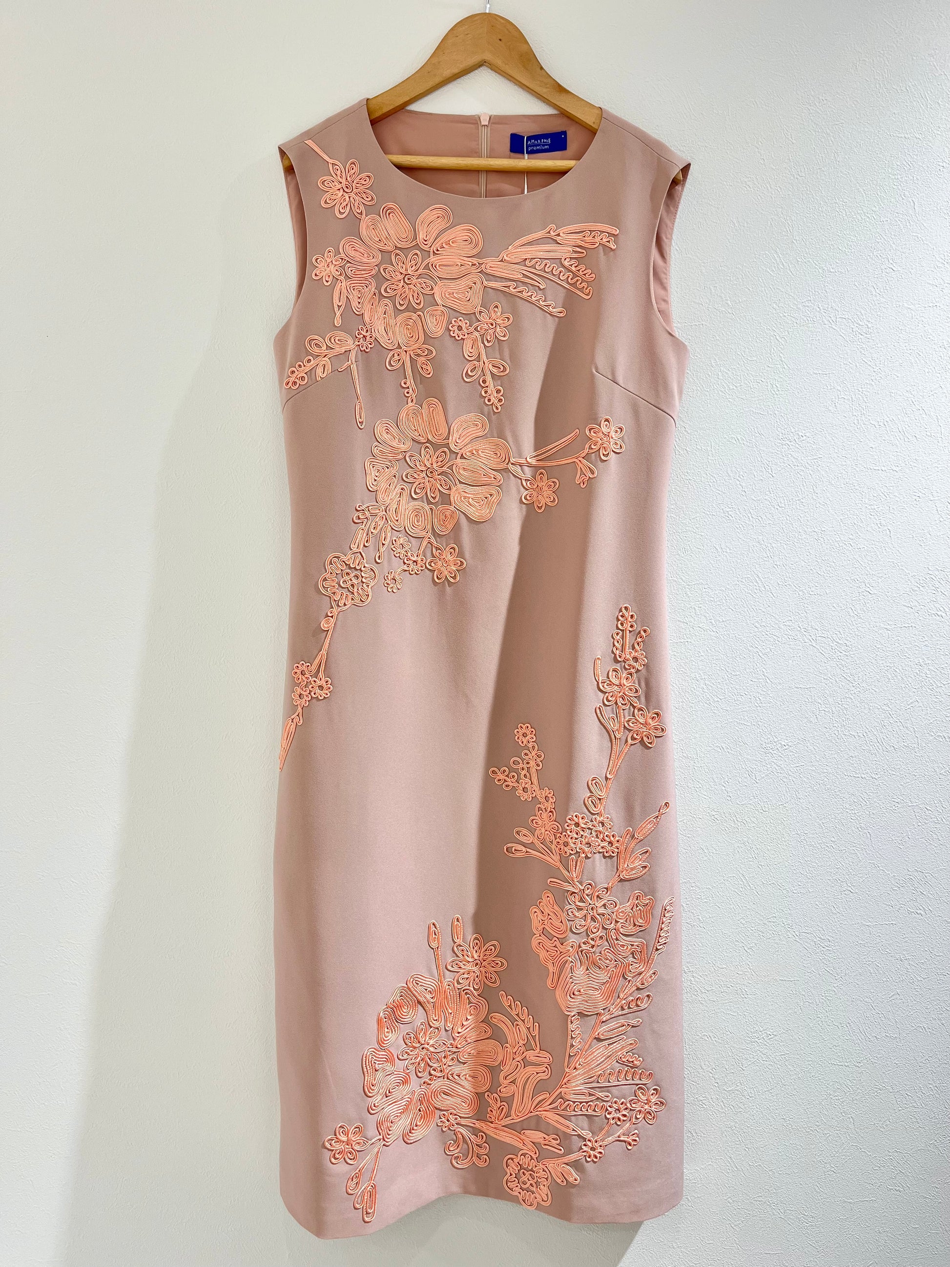ベージュ地のワンピースにピンクベージュの刺繍が施されております