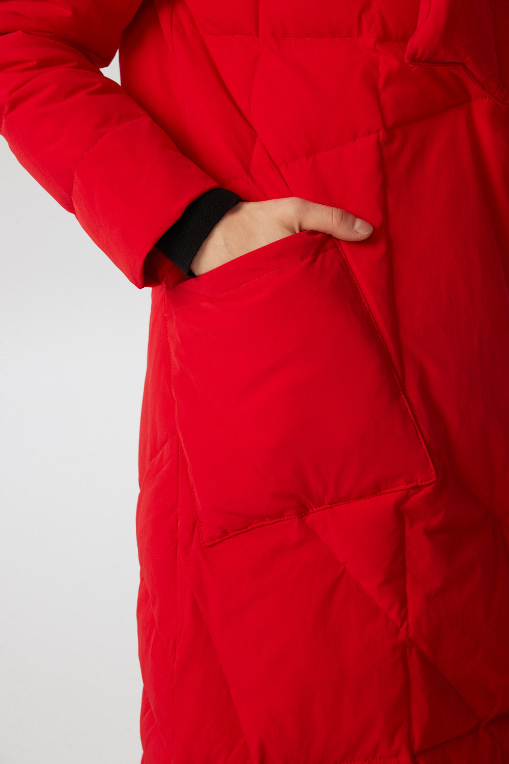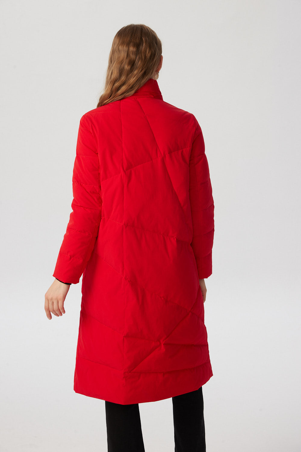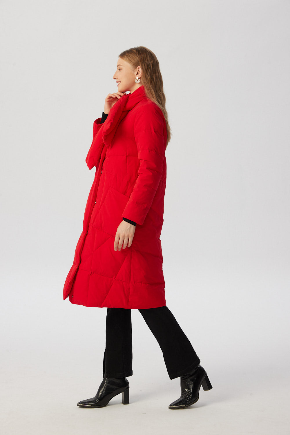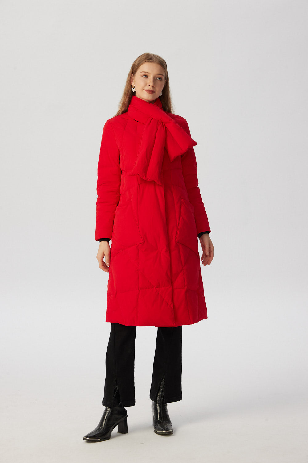 ボタンで付け外し可能なマフラーがついたダウンコート。