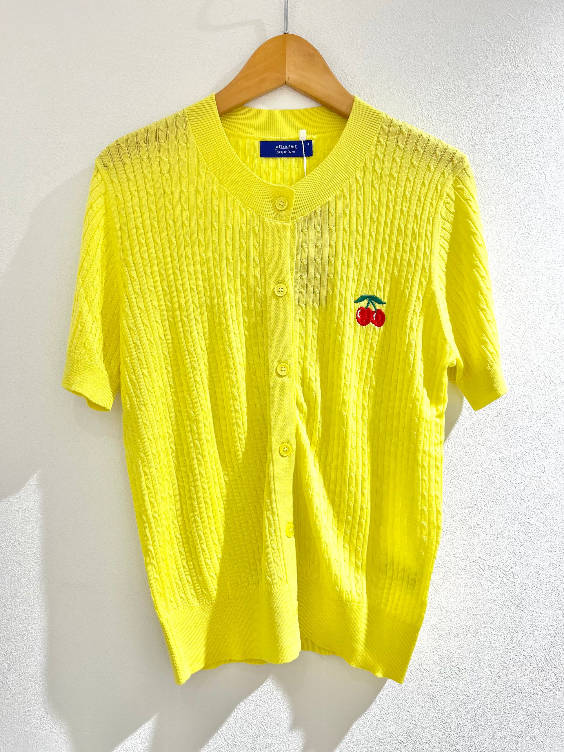 さくらんぼ刺繍半袖ニットカーディガン〈イエロー〉