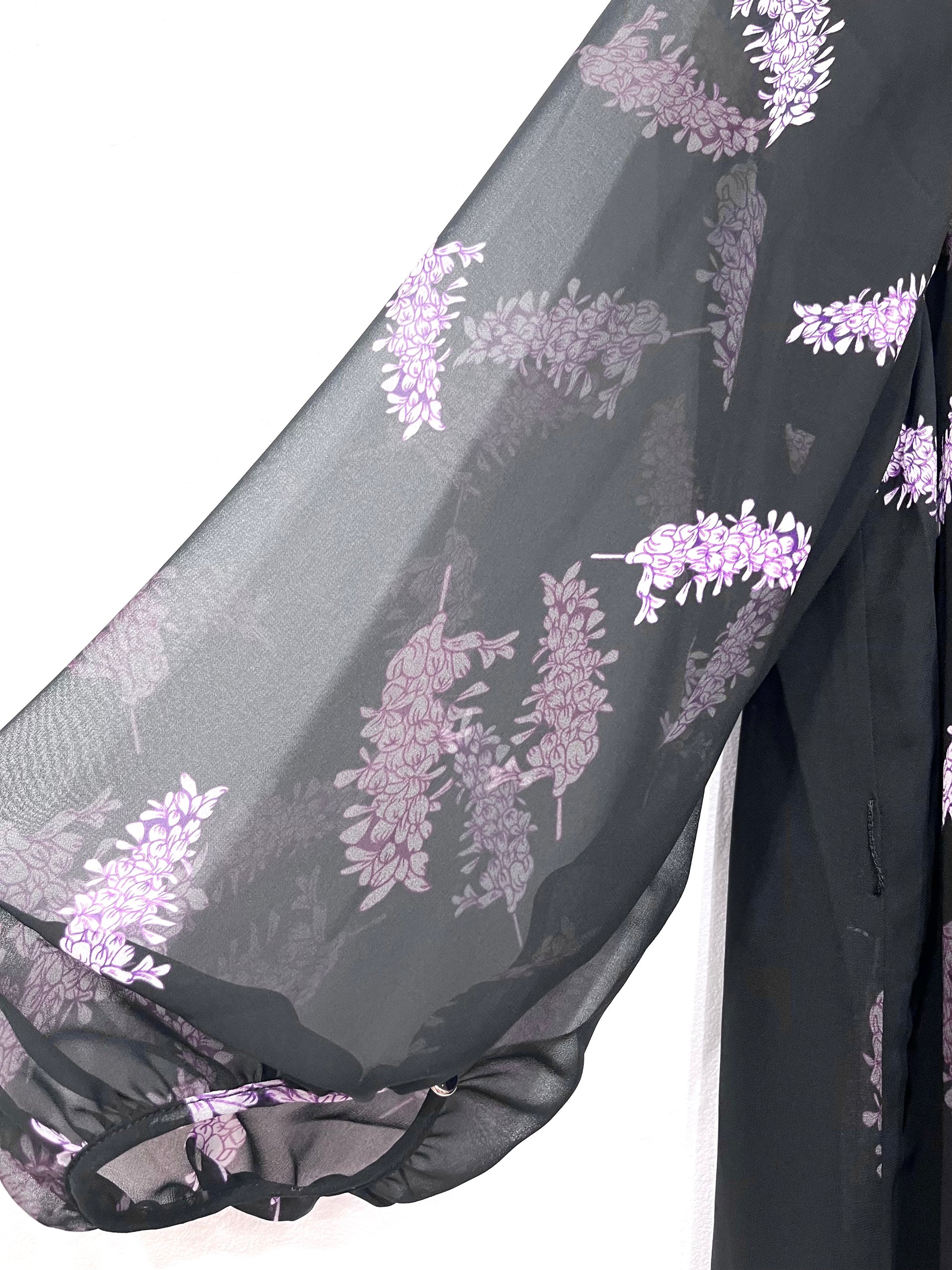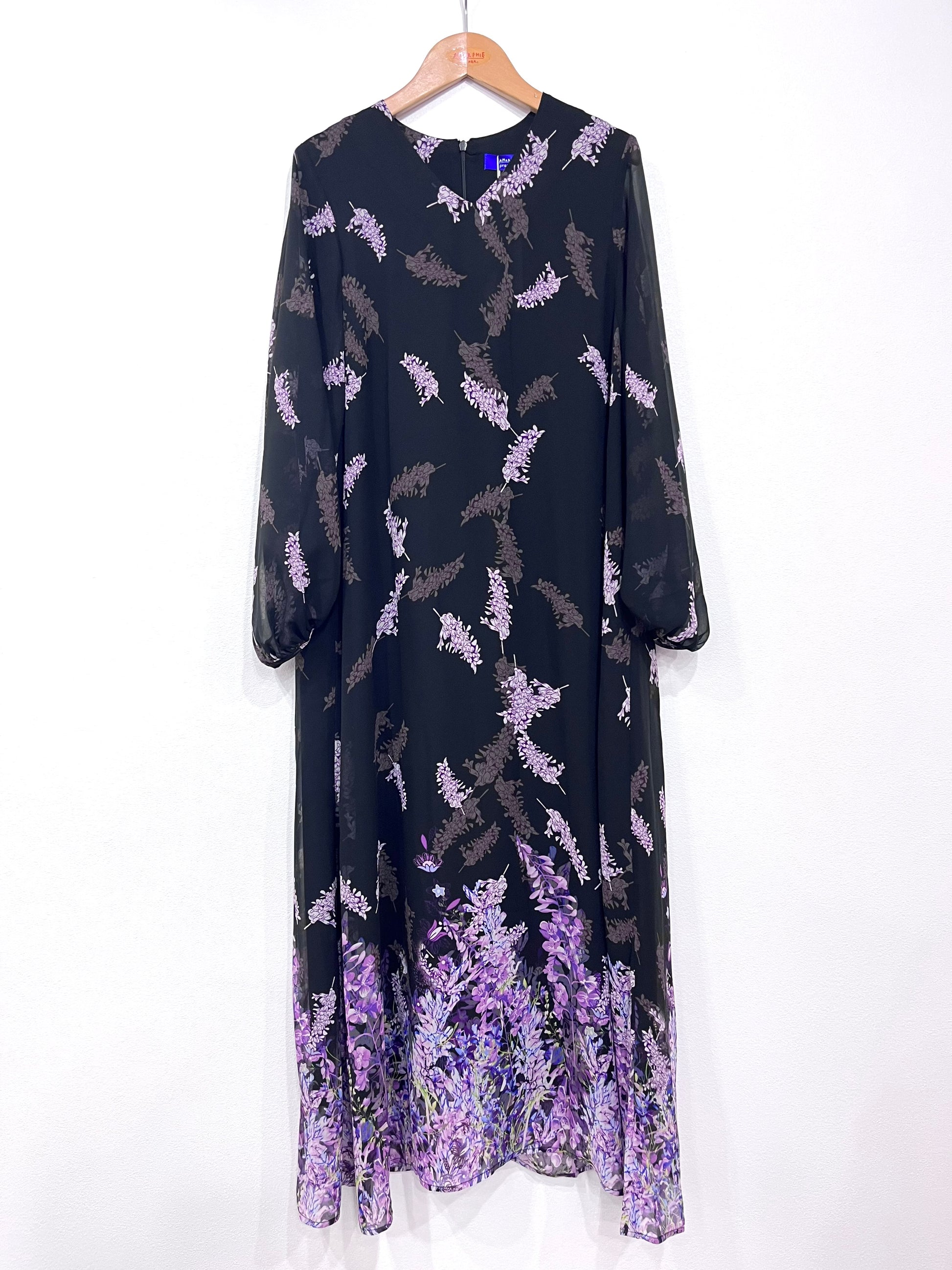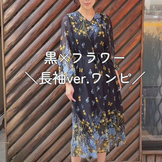 V襟ふんわり袖ワンピース〈パープル柄〉