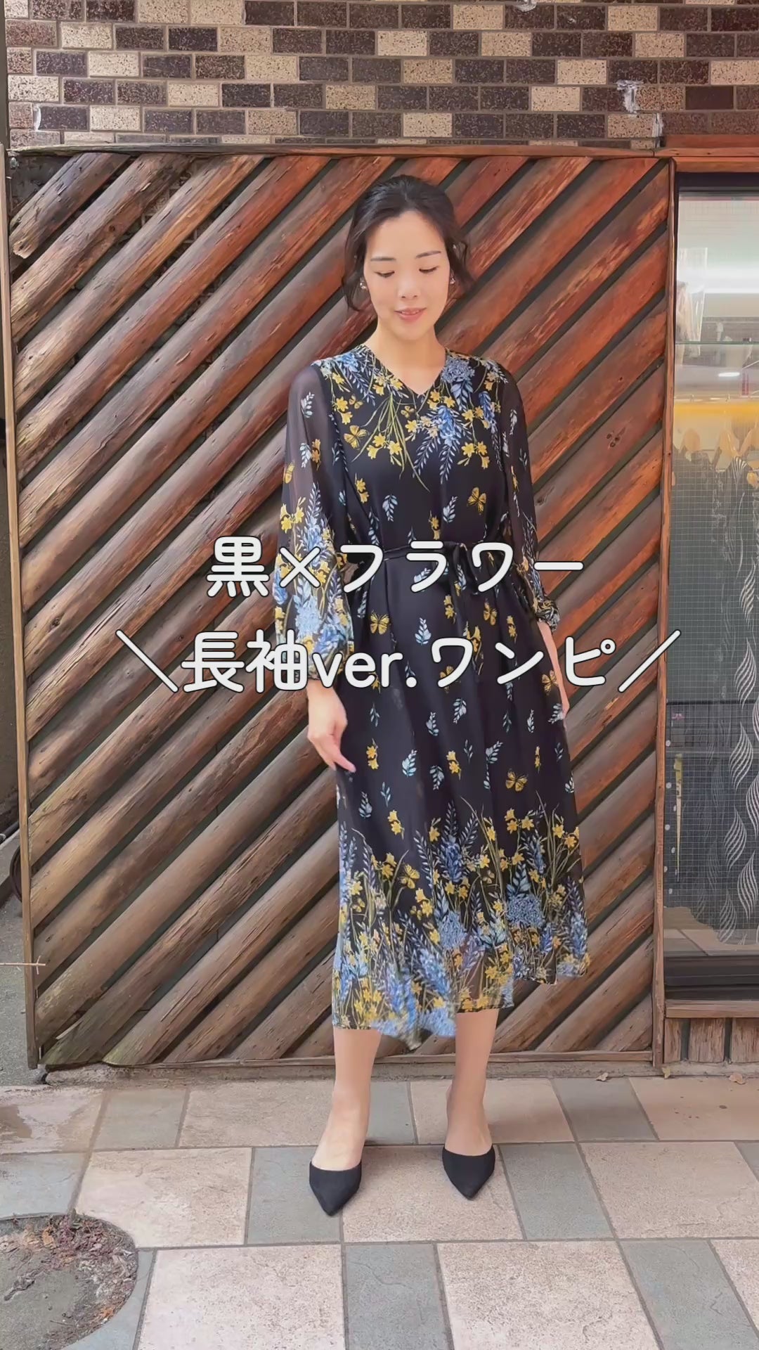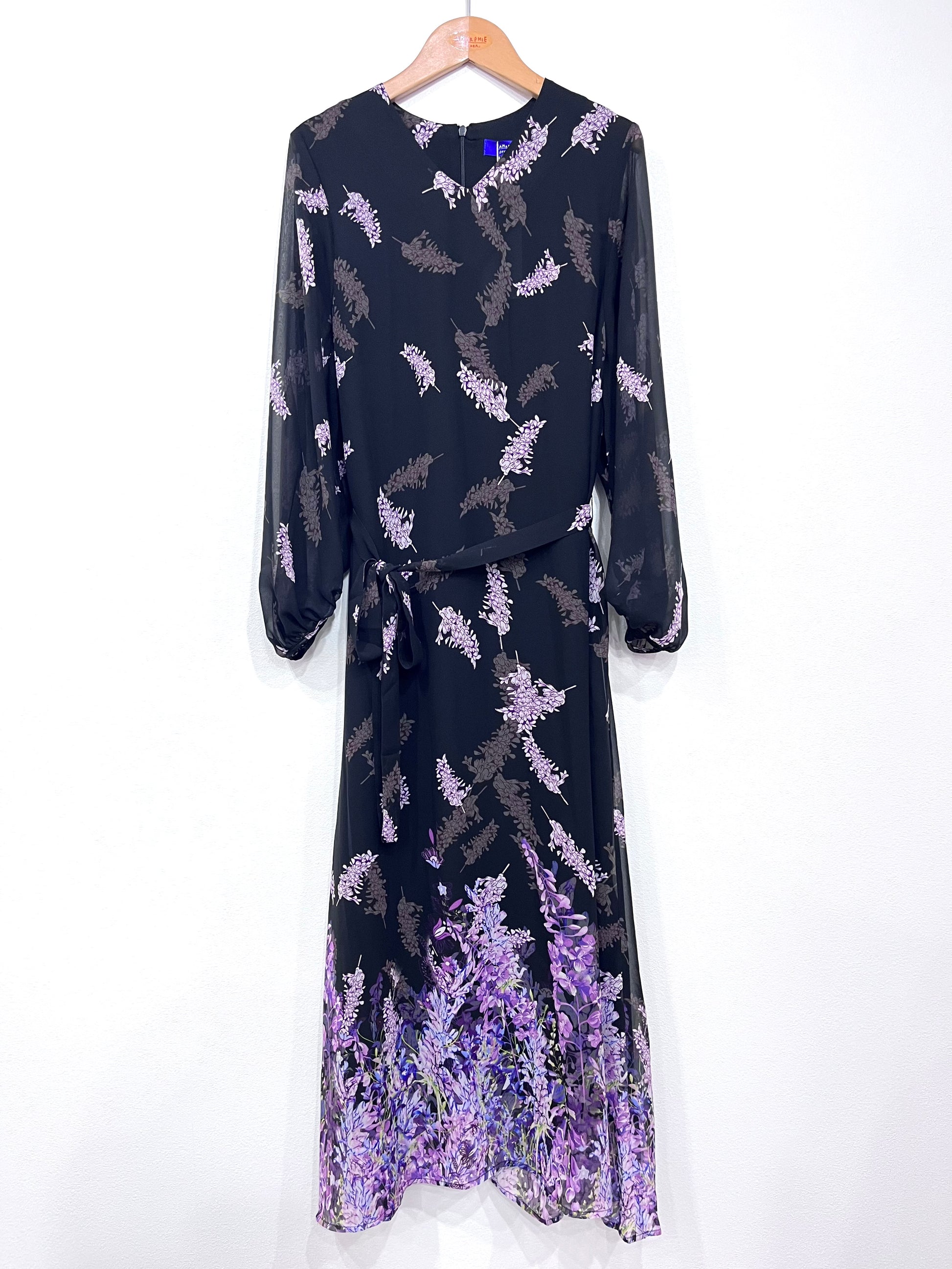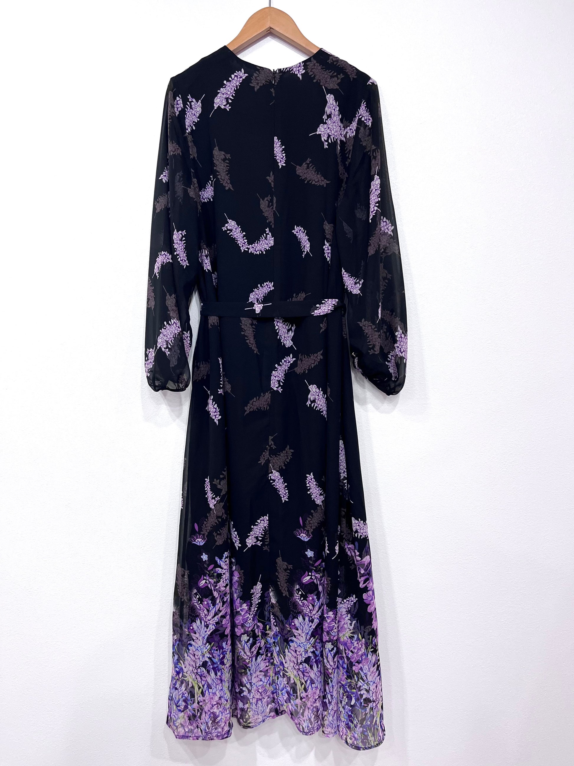 V襟ふんわり袖ワンピース〈パープル柄〉
