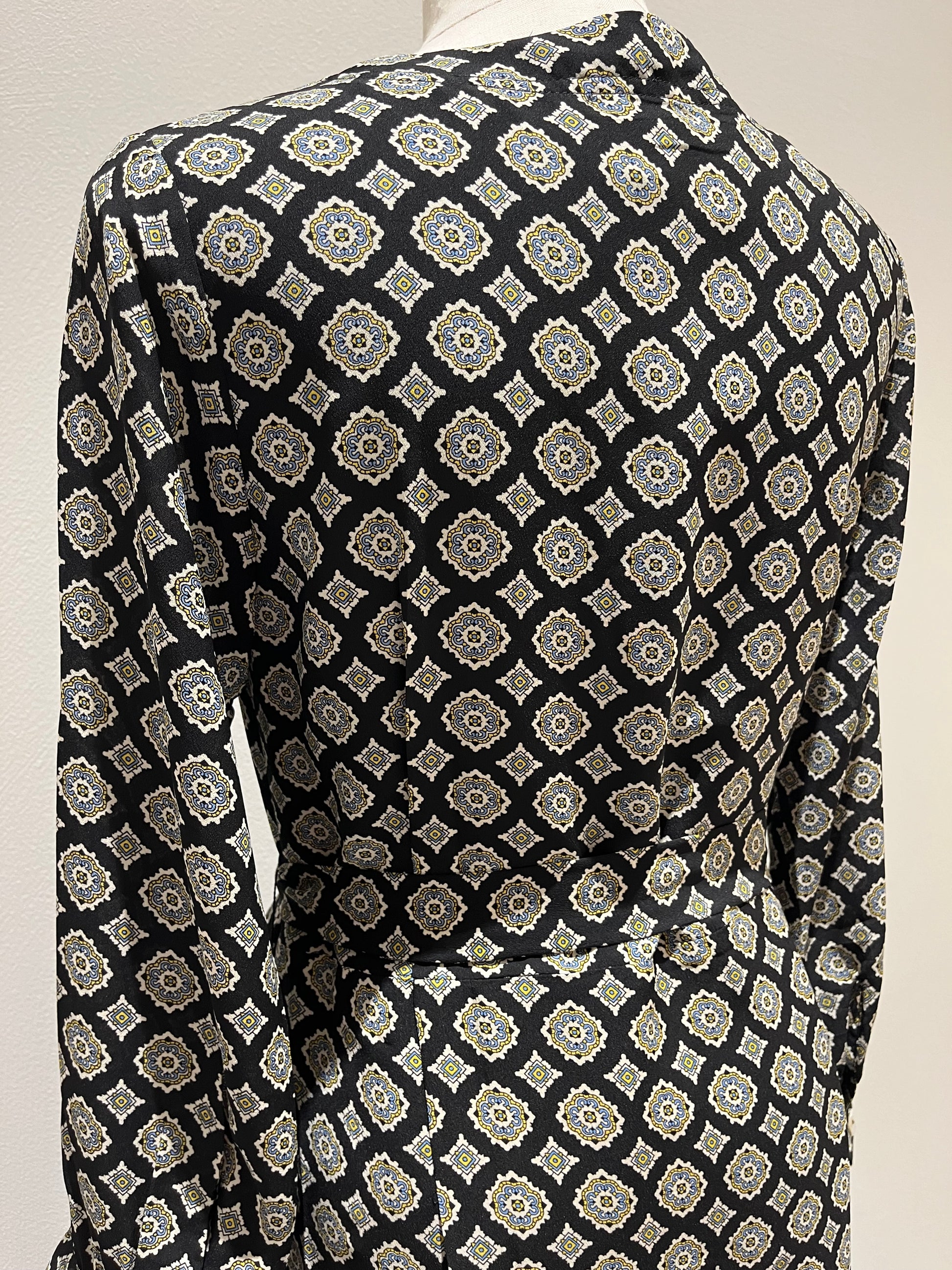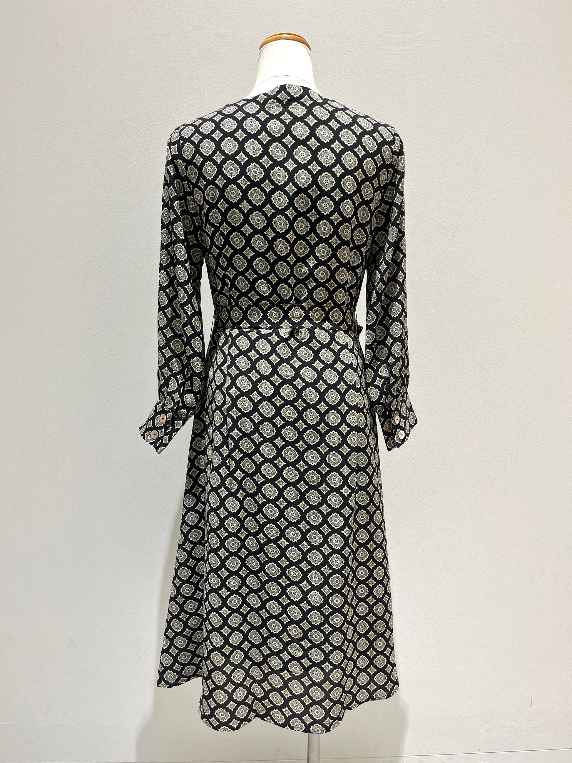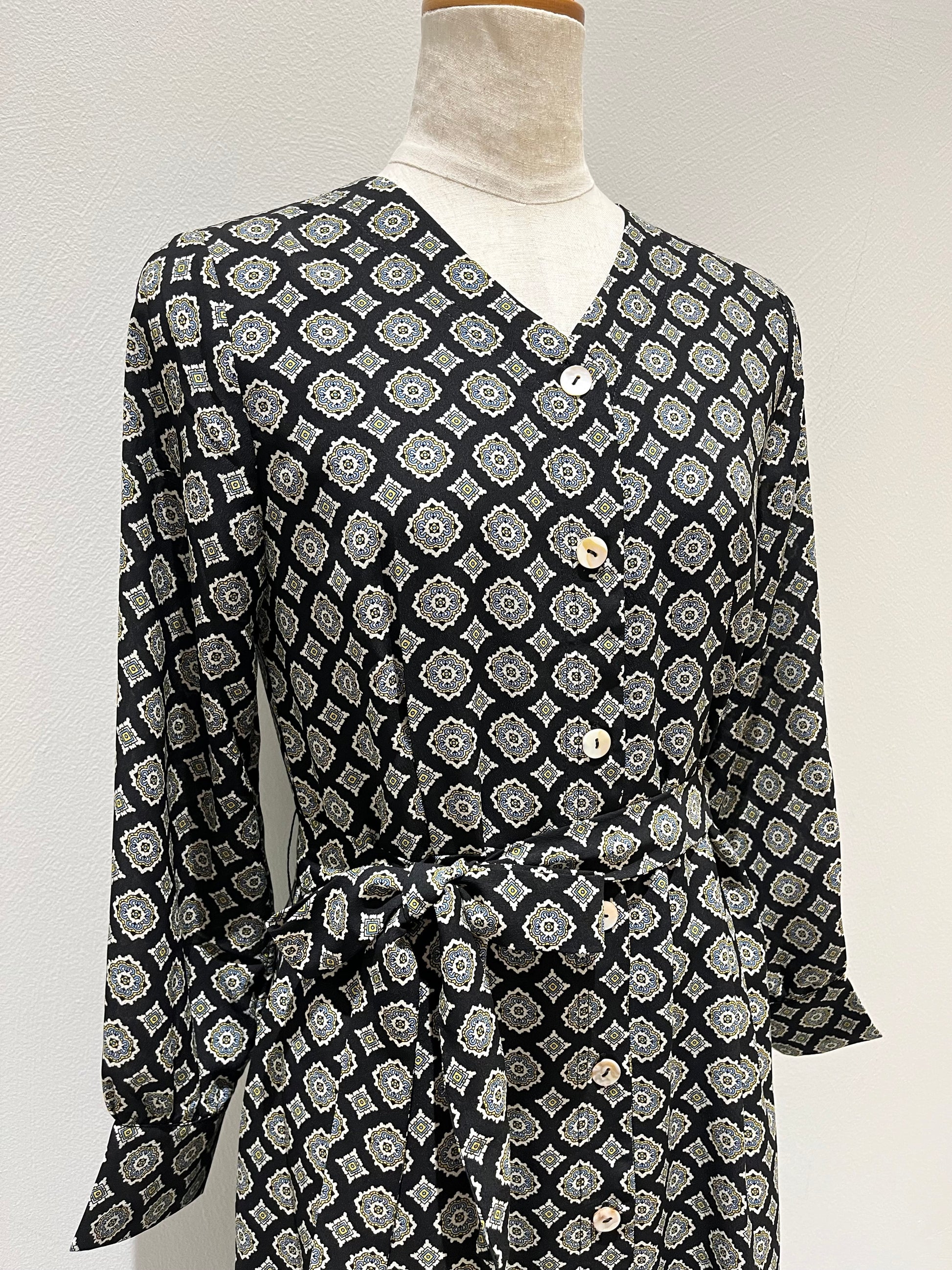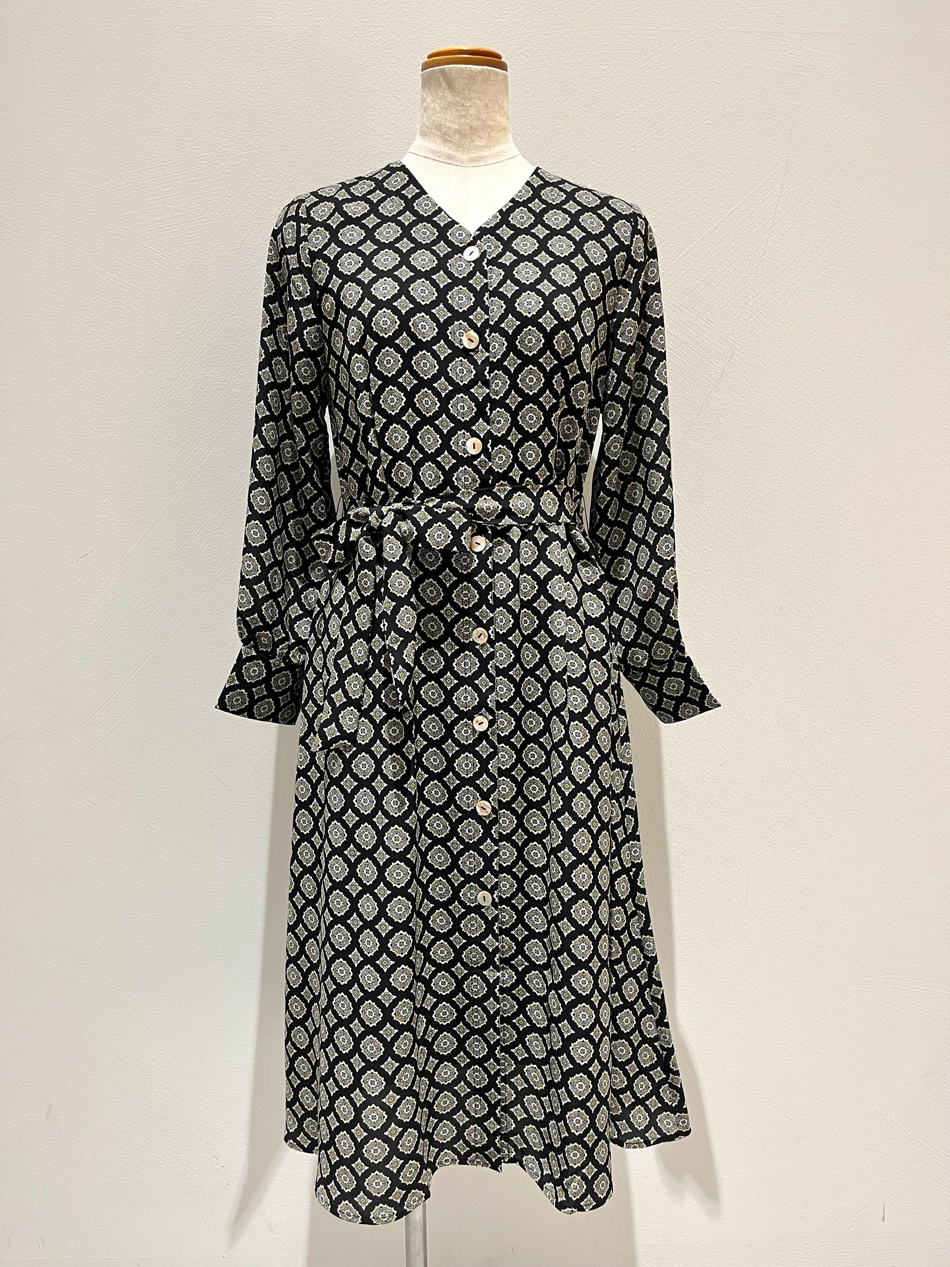 V襟前ボタンワンピース〈ブラック柄〉